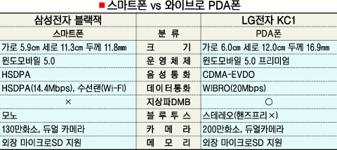 ¡®½º¸¶Æ®Æù »ì±î, PDAÆù »ì±î.¡¯°í¼ÓÀ¸·Î ¹«¼±µ¥ÀÌÅÍ ¼ºñ½º¸¦ ÀÌ¿ëÇÒ ¼ö ÀÖ´Â HSDPA(°í¼ÓÇÏÇâÆÐŶÁ¢¼Ó)¿Í ¿ÍÀ̺ê·Î µî 3.5¼¼´ë °í¼Ó³×Æ®¿öÅ© ½Ã´ë°¡ ¿¸®¸é¼ º°µµ ¿î¿µÃ¼Á¦¸¦ žÀçÇÑ °í¼º´É ´Ù±â´ÉÆùÀÌ ÀÕµû¶ó Ãâ½ÃµÇ°í ÀÖ´Ù. ƯÈ÷ ¾ÖÇÃÀÇ ¡®¾ÆÀÌÆù¡¯ÀÌ µ¹Ç³À» ÀÏÀ¸Å°¸é¼ ±¹³»¿¡¼ ¿Ü¸é¹Þ´ø ½º¸¶Æ®Æù, PDAÆù¿¡ ´ëÇÑ °ü½ÉÀÌ ´õ ³ô¾ÆÁö°í ÀÖ´Ù.½º¸¶Æ®ÆùÀÌ ÈÞ´ëÀüÈ¿¡ PDA ±â´ÉÀ» Ãß°¡Çß´Ù¸é PDAÆùÀº PDA¿¡ À̵¿Åë½Å ¸ðµâÀ» Áý¾î ³Ö¾î ÀüÈ ±â´ÉÀ» ±¸ÇöÇÑ °ÍÀÌ´Ù. ÃÖ±Ù Ãâ½ÃµÈ »ï¼ºÀüÀÚÀÇ ½º¸¶Æ®Æù ¡®¿ïÆ®¶ó¸Þ½Ã¡¡¯(ÀÏ¸í ¡®ºí·¢À衯)°ú LGÀüÀÚÀÇ ¿ÍÀ̺ê·ÎÆù ¡®KC1¡¯À» Á÷Á¢ ½áºÃ´Ù.