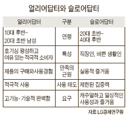 LG°æÁ¦¿¬±¸¿øÀº 28ÀÏ ÀÌ °°Àº È帧À» ¡°»õ·Ó°í º¹ÀâÇÑ ±â´É¿¡ ¿±¤ÇÏ´Â ¾ó¸®¾î´äÅÍ½Ä ¼Òºñ°¡ ÁÖÃãÇÏ°í ´Ü¼øÇÏ°í ´ëÁßÀû ÃëÇâÀ» °¡Áø ½½·Î¾î´äÅÍ(slow adopter)½Ä ¼Òºñ°¡ ºÎ»ó Áß¡±À̶ó°í ºÐ¼®Çß´Ù. Áö³ªÄ¡°Ô º¹ÀâÇÏ°í ¾î·Á¿î Á¦Ç°À̳ª ¼ºñ½º°¡ ÀϺΠ¸Å´Ï¾îÀÇ È£ÆòÀ» ¹ÞÀ»Áö ¸ð¸£Áö¸¸ ¹Ù»Û ÀÏ»ó¿¡ ¹¿© ÀÖ´Â ÀÏ¹Ý ¼ÒºñÀÚÇÑÅ×´Â ¿Ü¸é¹Þ±â ½±´Ù´Â ÁöÀûÀÌ´Ù.