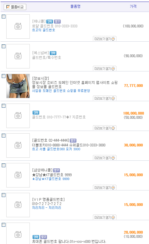ÀÎÅÍ³Ý °æ¸Å»çÀÌÆ®¿¡ ¿Á¼Ç¿¡ ¿Ã¶óÀÖ´Â À̸¥¹Ù ¡®010 °ñµå¹øÈ£(ÀνÄÀÌ ½¬¿î ÀüȹøÈ£)¡¯ ¸Å¹°ÀÌ´Ù. ¹øÈ£ ÁÖÀÎÀº ¡°ÇöÀç ¸î¸î ºÐµé°ú °¡°Ý ¹× ÁöºÒÁ¶°Ç¿¡ ´ëÇØ ÇùÀÇ ÁßÀÔ´Ï´Ù£¢¸ç È£±â½ÉÀ» ÀÚ±ØÇϰí ÀÖ´Ù. ÀÌ »çÀÌÆ®¿¡´Â 5ÀÏ ÇöÀç 9000¸¸¿ø(010-2030-4050)°ú 3000¸¸¿ø(010-8888-4444)Â¥¸® °í°¡ ¡®010 °ñµå¹øÈ£¡¯ µî ¼ö¹é°ÇÀÇ ¹°°ÇÀÌ ±¸¸ÅÀÚ¸¦ ±â´Ù¸®°í ÀÖ´Ù. ¾÷°è¿¡¼´Â À§ ¹°°ÇÀÌ ÆÈ¸± °¡´É¼ºÀº °ÅÀÇ ¾ø´Â °ÍÀ¸·Î º¸Áö¸¸ °ñµå¹øÈ£ÀÇ ¼ö¿ä°¡ ³ô¾ÆÁö°í ÀÖ´Â °Í¿¡ ´ëÇØ¼´Â ÀÎÁ¤ÇÏ´Â ºÐÀ§±â´Ù.