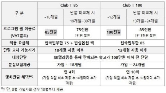 Ŭ·´T´Â ¡ãÁ¤¾× ¿ä±ÝÁ¦ ¡ã½º¸¶Æ®Æù ÇÒºÎ±Ý ¡ã°í°´ ¼­ºñ½º¸¦ ¹­Àº °ÍÀÌ Æ¯Â¡ÀÌ´Ù. 2Á¾·ù´Ù. Ŭ·´T85´Â ¿ù 9¸¸3500¿ø Ŭ·´T100Àº ¿ù 11¸¸¿øÀÌ´Ù. ÀüÀÚ´Â Àü±¹¹Î¹«ÇÑ75 ÈÄÀÚ´Â Àü±¹¹Î¹«ÇÑ85 ¿ä±ÝÁ¦ ±â¹ÝÀÌ´Ù. Ŭ·´T85´Â 30°³¿ù Ŭ·´T100Àº 24°³¿ù ¾àÁ¤ÀÌ ±âº»ÀÌ´Ù.
