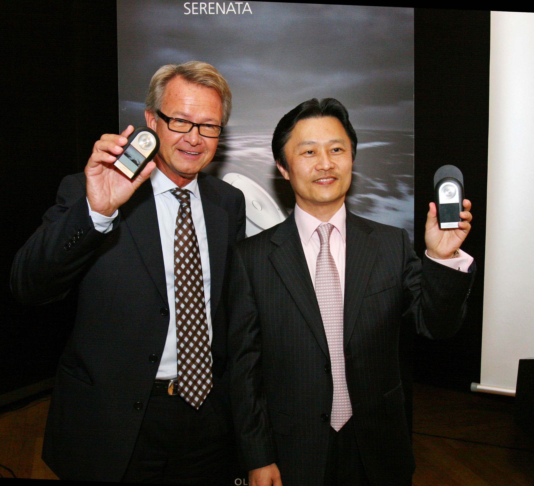 ÇöÁö½Ã°£ 1ÀÏ, º£¸¦¸° ÇÏ¾æÆ® È£ÅÚ¿¡¼­ ÀÖ¾ú´ø ÇÁ¸®¹Ì¾ö ¹ÂÁ÷Æù £§¼¼·¹³ªÅ¸£§(SGH-F310) ¹ßÇ¥ ±âÀÚȸ°ßÀå¿¡¼­ ¹ð¾Ø¿Ã·ì½¼ CEO Åç¹ø ¼Ò·»½¼(Torben Ballegaard Sorensen)¿Í »ï¼ºÀüÀÚ Á¤º¸Åë½ÅÃѰý Áö¿µÁ¶ Àü¹«°¡ ¾ç»çÀÇ µÎ¹øÂ° ÇÕÀÛǰÀÎ £§¼¼·¹³ªÅ¸£§¸¦ µé°í »çÀÌÁÁ°Ô ¿ôÀ½Áþ°í ÀÖ´Ù.