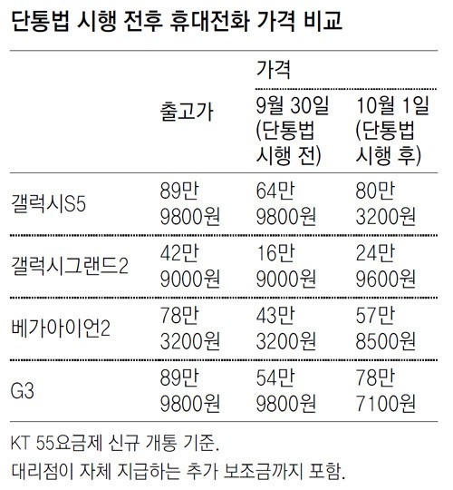 ¡®À̵¿Åë½Å´Ü¸»ÀåÄ¡ À¯Å뱸Á¶°³¼±¹ý(´ÜÅë¹ý)¡¯ ½ÃÇà ù³¯ÀÎ 1ÀÏ ¼­¿ï µ¿ÀÛ±¸ µ¿ÀÛ´ë·Î¿¡ ÀÖ´Â ÇÑ À̵¿Åë½Å»ç ´ë¸®Á¡¿¡ µé¾î¼­ÀÚ Á÷¿øÀÌ ´ë¶ä ÀÌ·¸°Ô ¸»Çß´Ù. ±×´Â Ãâ°í°¡ 89¸¸9800¿øÀÎ ¡®°¶·°½ÃS5¡¯¿Í ¡®G3¡¯¸¦ ²¨³» º¸ÀÌ¸ç ¡°¾îÁ¦±îÁø 30¸¸ ¿ø ÀÌ»ó µå·È´Âµ¥ ¿À´ÃºÎÅÏ ¿ù 10¸¸ ¿øÂ¥¸® ¿ä±ÝÁ¦¿¡ °¡ÀÔÇØµµ ±â±â °ªÀº 10¸¸ ¿ø Á¤µµ¹Û¿¡ Áö¿øÀÌ ¾È µÈ´Ù¡±°í ¸»Çß´Ù.