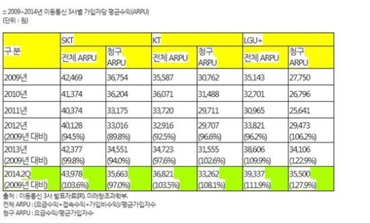 ¹Ì·¡ºÎ°¡ Á¦ÃâÇÑ £§2009~2014³â À̵¿Åë½Å 3»çº° ARPU£§¿¡ µû¸£¸é, SKÅÚ·¹ÄÞÀº Áö³­ÇØ ARPU´Â 4¸¸3987¿ø(ÀüüARPU)À¸·Î ÀÌÅë3»ç Áß °¡Àå ³ô¾Ò´Ù. °¡ÀÔÀÚ Æ÷È­·Î 2012³â °¡ÀÔÀÚ´ç Æò±Õ¼öÀÍ(ARPU)ÀÌ ´Ù¼Ò ¶³¾îÁö´Â °Íó·³ º¸¿´Áö¸¸, Áö³­ÇØ¿Í ¿ÃÇØ ¿¬¼Ó ½ÇÀûÀÌ °³¼±µÆ´Ù.