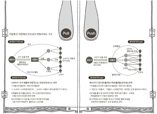 ¡¡Æ¯È÷ ¡®¹Ð¾î³»±â(Push)¡¯¿Í ¡®²ø¾î´ç±â±â(Pull)¡¯´Â ÀÌÅë »ç¾÷¿¡¼µµ ±âº»ÀûÀ̸鼵µ ÇÙ½ÉÀûÀÎ À¯Åë Àü·«À¸·Î ²ÅÈù´Ù. Çõ½ÅÀûÀÎ ½ÅÁ¦Ç°À» ³»³ùÀ» ¶§´Â ±¤°í³ª ÀÔ¼Ò¹®À» ÅëÇØ Ãâ½Ã Ãʱ⿡ ¼ÒºñÀÚµéÀÇ ½Ã¼±À» ²ø¾î´ç°Ü¾ß (pull)Çϸç , ºñ¼ö±â¿¡´Â Á¦Ç°À» À¯Åë üÀÎ(chain)¿¡ ÁÖ¹® ¼ö·®º¸´Ù ¾ó¸¶¸¸Å ´õ ¸¹ÀÌ ¹Ð¾î³»´À³Ä(push)¿¡ µû¶ó ½ÇÀû ºÎÁøÀ» »ó¼âÇÒ ¼ö ÀÖ´Ù.