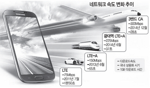 3¹êµå CA´Â 20MHzÀÇ ±¤´ë¿ª Á֯ļö¿¡ 10MHz ÀÏ¹Ý Á֯ļö 2°³ µî 3°³ÀÇ Á֯ļö ´ë¿ªÀ» ¹¾î ÃÖ°í 300MbpsÀÇ ¼Óµµ¸¦ ³»´Â ±â¼úÀÌ´Ù. 4¼¼´ë ÃÖÃÊ ¹öÀüÀÎ ·ÕÅÒ¿¡º¼·ù¼Ç(LTE)ÀÇ ÃÖ°í¼Óµµ 75Mbpsº¸´Ù´Â 4¹è, 3¹øÂ° ¹öÀüÀÎ ±¤´ë¿ª LTE-AÀÇ ÃÖ°í¼ÓµµÀÎ 225Mbpsº¸´Ù 30% ºü¸¥ ¼Óµµ¸¦ ÀÚ¶ûÇÑ´Ù. ü°¨¼Óµµ´Â ±¤´ë¿ª LTE-A°¡ 70~80MbpsÀÎ Á¡À» °¨¾ÈÇϸé 90~100Mbps¿¡ ´ÞÇÒ °ÍÀ¸·Î ¿¹»óµÈ´Ù. ÇÑ ¿¹·Î 1GB ¿µÈ¸¦ ´Ù¿î·Îµå ÇÒ °æ¿ì ±¤´ë¿ª LTE-A´Â 37Ãʰ¡ ¼Ò¿äµÇ´Â µÇ¸é 3¹êµå CA´Â 28ÃÊ ¹Û¿¡ ¾È °É¸°´Ù.