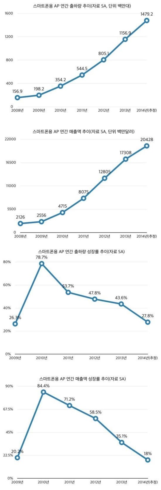 9ÀÏ ½ÃÀåÁ¶»ç¾÷ü ½ºÆ®·¡Æ¼Áö¾Ö³Î¸®Æ½½º(SA)°¡ ÃÖ±Ù ¹ßÇ¥ÇÑ ¿¹ºñÁ¶»ç ÀÚ·á¿¡ µû¸£¸é Áö³­ÇØ ½º¸¶Æ®Æù¿ë AP ÃâÇÏ·®Àº 14¾ï7900¸¸´ë, ¸ÅÃâ¾×Àº 204¾ï2800¸¸´Þ·¯¸¦ ±â·ÏÇÑ °ÍÀ¸·Î ÃßÁ¤µÆ´Ù. Àü³â ´ëºñ °¢°¢ 27.8% 18% ¼ºÀåÇÑ ¼öÄ¡´Ù. ÀÌ °°Àº ¼ºÀåÀ²Àº °ú°Å ´ëºñ Å©°Ô ¸ø ¹ÌÄ¡´Â °ÍÀÌ´Ù. Áö³­ÇØ ÃâÇÏ ¼ºÀå·üÀº 43.6%, ¸ÅÃâ ¼ºÀå·üÀº 35.1%¿´´Ù. ½º¸¶Æ®Æù¿ë AP ÃâÇÏ ¼ºÀå·üÀº 2010³â Á¤Á¡À» ÂïÀº ÀÌÈÄ ¸Å³â Á¶±Ý¾¿ µÐÈ­µÅ ¿ÔÁö¸¸ Áö³­ÇØ ¼ºÀå·ü °¨¼ÒÆøÀº »ó´çÈ÷ ÄÇ´ø °ÍÀ¸·Î ³ªÅ¸³µ´Ù.