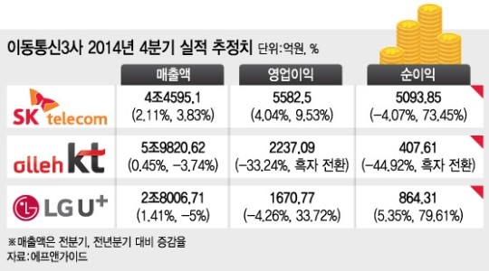 12ÀÏ »óÀå±â¾÷ºÐ¼®¾÷üÀÎ ¿¡ÇÁ¾Ø°¡À̵尡 9ÀÏ ±âÁØÀ¸·Î Áý°èÇÑ Áõ±Ç»çÀÇ ÃßÁ¤Ä¡¸¦ º¸¸é Åë½Å 3»çÀÇ Áö³­ÇØ 4ºÐ±â ¿µ¾÷ÀÌÀÍÀº 9491¾ï¿øÀ¸·Î ÀüºÐ±â(1Á¶462¾ï¿ø) º¸´Ù 971¾ï¿ø ÁÙ¾îµé Àü¸ÁÀÌ´Ù. Àü³â µ¿±âÀÎ 2013³â 4ºÐ±â(4506¾ï¿ø)¿Í ºñ±³Çؼ­´Â 4985¾ï¿ø ´õ ´Ã¾î³¯ Àü¸ÁÀÌ´Ù. ´ç½Ã KT°¡ 1840¾ï¿øÀÇ ÀûÀÚ¸¦ ±â·ÏÇØ ÀÌÅë3»çÀÇ ÃÑ ¿µ¾÷ÀÌÀÍ ±Ô¸ð°¡ Å©°Ô ÁÙ¾ú¾ú´Ù.