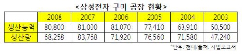 ¡ß°æ±â ħü, ¿ø°¡Àý°¨ »ýÁ¸ ¹®Á¦·Î ¡®ºÎ°¢¡¯=3ÀÏ Áö³ 3¿ù31ÀÏ »ï¼ºÀüÀÚ°¡ °ø½ÃÇÑ 2008³â »ç¾÷º¸°í¼¿¡ µû¸£¸é Áö³ÇØ ±¸¹Ì ÈÞ´ëÆù °øÀåÀÇ »ý»ê·®Àº 6825¸¸8000´ë´Ù. Àü³â´ëºñ 1550¸¸5000´ë°¡ ÁÙ¾îµé¾ú´Ù. Áö³ 2004³â ÀÌÈÄ °¡Àå ³·Àº ¼öÄ¡´Ù. »ï¼ºÀüÀÚ ±¸¹Ì ÈÞ´ëÆù °øÀåÀº Áö³ 2007³â¿¡´Â 8376¸¸3000´ë, 2006³â¿¡´Â 7192¸¸´ë¸¦ ¸¸µé¾ú´Ù.