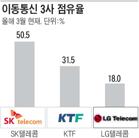 ÇöÀç À̵¿Åë½Å ½ÃÀå Á¡À¯À²Àº 5´ë3´ë2 ±¸µµ´Ù. 50.5%¸¦ ±â·ÏÇÑ SKÅÚ·¹ÄÞÀÌ ¼±µÎ°í, KTF¿Í LGÅÚ·¹ÄÞÀÌ °¢°¢ 31.5%, 18.0%¸¦ Â÷ÁöÇϰí ÀÖ´Ù. SKÅÚ·¹ÄÞÀÇ °æ¿ì, â»ç ÀÌ·¡ 50% ÀÌÇÏ·Î ³»·Á°£ ÀûÀÌ ¾ø´Ù. ´ëºÎºÐÀÇ Àü¹®°¡µéµµ À̵¿ÀüÈ ½ÃÀåÀÌ Æ÷ÈµÈ »óȲ¿¡¼ ÃâÇ÷ °æÀïÀº ÀϾÁö ¾ÊÀ» °ÍÀ̶õ ÀǰßÀ» ³»³õ°í ÀÖ´Ù.