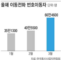 Çѱ¹Åë½Å»ç¾÷ÀÚ¿¬ÇÕȸ¿¡ µû¸£¸é À̵¿Åë½Å 3»ç ¹øÈ£À̵¿ °¡ÀÔÀÚ ¼ö´Â Áö³ 1¿ù 35¸¸1300¸í¿¡¼ 2¿ù 40¸¸5500¸íÀ¸·Î ¿Ã¶ó¼¹´Ù°¡ 3¿ù 66¸¸4600¸íÀ¸·Î ±ÞÁõÇß´Ù. ÀÛ³â 8¿ù ÀÌÈÄ ÃÖ°íÄ¡´Ù. ¿Ã 1¡¤2¿ù¿¡ ´«Ä¡ º¸´Â Ž»öÀüÀ» ¹úÀÌ´Ù°¡ Áö³´ÞºÎÅÍ º»°Ý ÀüÅõ¸¦ ÆîÄ¡°í ÀÖ´Â ¼ÀÀÌ´Ù. ÀÌ·± Ãß¼¼´Â ÀÌ´Þ µé¾î °è¼ÓµÇ°í ÀÖ´Ù.