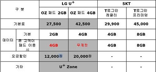 LG À¯Ç÷¯½º´Â °¶·°½ÃÅÇÀ» Ãâ½ÃÇÏ¸é¼ OZ ÆÐµå ¿ä±ÝÁ¦¸¦ »õ·Ó°Ô ¼±º¸¿´´Ù. 2GB¿Í 4GB µÎ Á¾ÀÇ ¿ä±ÝÁ¦°¡ ÀÖÀ¸¸ç, ±âº»·á´Â °¢°¢ 2¸¸7500¿ø°ú 4¸¸2500¿øÀ¸·Î KTÀÇ SHOW µ¥ÀÌÅÍ ÆØ»ý ¿ä±ÝÁ¦¿Í µ¿ÀÏÇÏ´Ù. ÃÖ±Ù µ¥ÀÌÅÍ Á¦°ø·®À» µÎ ¹è·Î ´Ã¸° SKTÀÇ T·Î±×ÀÎ ·¹±Ö·¯¿Í ÇÁ¸®¹Ì¾ö°ú ºñ±³Çغ¸¸é, ¿ä±ÝÀº ¿ù 2õ5¹é ¿ø °¡·® Àú·ÅÇÏÁö¸¸ µ¥ÀÌÅÍ »ç¿ë·®Àº Àý¹Ý¿¡ ºÒ°úÇÏ´Ù.