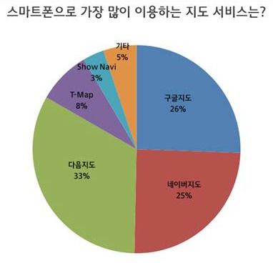 ¡®½º¸¶Æ®ÆùÀ¸·Î °¡Àå ¸¹ÀÌ ÀÌ¿ëÇÏ´Â Áöµµ ¼­ºñ½º´Â¡¯À̶õ Áú¹®¿¡ ÀÀ´äÀÚÀÇ 33%´Â ¡®´ÙÀ½ Áöµµ¡¯¸¦ ²Å¾ÒÀ¸¸ç ¡®±¸±Û Áöµµ¡¯°¡ 26% µæÇ¥À²·Î µÚ¸¦ À̾ú´Ù. ¡®³×À̹ö Áöµµ¡¯´Â ±¸±Û Áöµµº¸´Ù Á¶±Ý ³·Àº 25% µæÇ¥À²·Î 3À§¸¦ ±â·ÏÇßÀ¸¸ç ¡®T¸Ê¡¯, ¡®¼î³»ºñ¡¯ µîÀÌ °¢°¢ 8%, 3%·Î 4, 5À§¿¡ ¿Ã¶ú´Ù. ´ÙÀ½¡¤±¸±Û¡¤³×À̹ö Áöµµ ÀÌ¿ëÀÚ ºñÀ²À» ÇÕÇϸé 84%·Î ±¸±ÛÀ» Æ÷ÇÔÇÑ Æ÷ÅÐ Áöµµ ÀÌ¿ëÀÚ°¡ ´ë´Ù¼ö¸¦ Â÷ÁöÇß´Ù.
