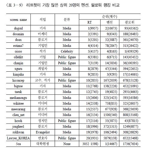 RT°¡ °¡Àå ¸¹Àº »óÀ§ 20¸í ¾È¿¡ ¿¬¿¹ÀÎÀ̳ª Á¤Ä¡Àκ¸´Ù ´º½º¹Ìµð¾î ±â´ÉÀ» ¼öÇàÇÏ´Â »ç¶÷ÀÌ 70%¸¦ Â÷ÁöÇÏ´Â Á¡µµ ´«¿¡ ¶è´Ù. À̵é ÀÌ¿ëÀÚ´Â Á÷¾÷ÀÌ ±âÀÚÀ̰ųª Æ®À§ÅÍ ¾È¿¡¼­ Á¤º¸¿Í ¼Ò½ÄÀ» Àü´ÞÇÏ´Â ¿ªÇÒÀ» ¼öÇàÇÑ´Ù. ÀÌ·¯ÇÑ °á°ú´Â Æ®À§ÅÍ ¿µÇâ·ÂÀÌ RT Ƚ¼ö¿¡ ´Þ·È´Ù´Â À§ ³»¿ë°ú °ü·ÃµÈ´Ù. ÆÈ·Î¾î ¼ö°¡ ¸¹Àº À¯¸íÀκ¸´Ù ±×µéÀÇ ¸Þ½ÃÁö¸¦ ¸¹Àº »ç¶÷¿¡°Ô RT¸¦ ÅëÇØ Àü´ÞÇÏ´Â ÀüÆÄÀÚÀÇ ¿ªÇÒÀÌ Áß¿äÇÏ°Ô ÀÛ¿ëÇÏ´Â ¼ÀÀÌ´Ù.