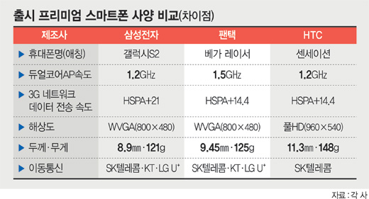 ¹Ý¸é µð½ºÇ÷¹ÀÌ ÇØ»óµµ´Â £§¼¾¼¼À̼ǣ§ÀÌ Ç® °íÈ­Áú(Full HD) 960¡¿540À¸·Î °¡Àå ³ô´Ù. À¥ ºê¶ó¿ì¡ ¼Óµµ´Â 1.5±â°¡Ç츣Ã÷(§×)¸¦ ÀåÂøÇÑ £§º£°¡ ·¹À̼­£§°¡ °¡Àå ºü¸£´Ù. ±Ù°Å¸® ¹«¼±Åë½Å(NFC)Àº £§°¶·°½ÃS2£§¿Í £§º£°¡ ·¹À̼­£§¸¸ ÀåÂøÇß´Ù. £§¼¾¼¼À̼ǣ§Àº Áö»óÆÄ µðÁöÅÐ¸ÖÆ¼¹Ìµð¾î¹æ¼Û(DMB) ±â´Éµµ ºüÁ® ÀÖ´Ù.