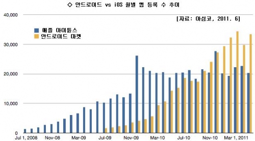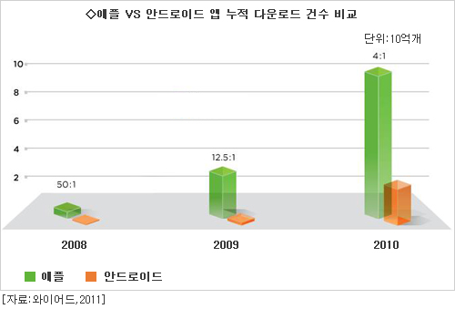 ¿À¹üÀº ¿À´Â 2015³â±îÁö ¾Èµå·ÎÀÌµå ¾Û ´Ù¿î·Îµå °Ç¼ö´Â ¿¬ Æò±Õ 80% ÀÌ»ó Áõ°¡ÇÒ °ÍÀ¸·Î Àü¸ÁÇß´Ù. ¹Ý¸é °°Àº ±â°£ ¾ÆÀÌÆù ¾ÛÀÇ ´Ù¿î·Îµå °Ç¼ö Áõ°¡À²Àº 30%¸¦ Á¶±Ý ¿ôµ¹ °ÍÀ¸·Î Àü¸ÁµÆ´Ù. Àû¾îµµ ¼ýÀûÀÎ ¸é¿¡¼± ¾Èµå·ÎÀÌµå ±º´ÜÀÌ ¾ÆÀÌÆù Áø¿µÀ» ¿ÏÀüÈ÷ ³Ñ¾î¼±´Ù´Â ¾ê±â´Ù. ¡ß±Ô¸ð ¸øÁö ¾Ê°Ô ³»½Ç¿¡µµ ´«±æ µ¹·Á¾ß