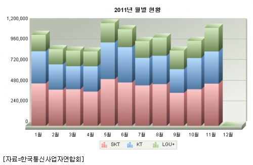 1ÀÏ Çѱ¹Åë½Å»ç¾÷ÀÚ¿¬ÇÕȸ(KTOA)°¡ °ø°³ÇÑ 11¿ù À̵¿Åë½Å ¹øÈ£À̵¿ ÇöȲ¿¡ µû¸£¸é KT´Â SKÅÚ·¹ÄÞ¿¡¼ 24¸¸9õ434¸í, LGÀ¯Ç÷¯½º¿¡¼ 8¸¸243¸íÀÇ °¡ÀÔÀÚ¸¦ ²ø¾î¿Í ÃÑ 32¸¸9õ677¸íÀÇ °¡ÀÔÀÚ¸¦ À¯Ä¡Çß´Ù. ÀÌÁß SKÅÚ·¹ÄÞÀ̳ª LGÀ¯Ç÷¯½º·Î ¹øÈ£À̵¿À» ÇØ ³ª°£ °¡ÀÔÀÚ´Â 31¸¸5õ542¸íÀ¸·Î, 11¿ù¿¡ 1¸¸4õ126¸íÀÇ °¡ÀÔÀÚ°¡ ¼øÁõÇß´Ù.