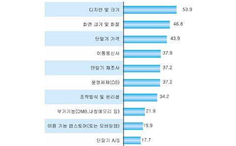 ½º¸¶Æ®ÆùÀ» ±¸¸ÅÇÒ ¶§ ÀÌ¿ëÀÚµéÀº ¡®µðÀÚÀÎ ¹× Å©±â(53.9%)¡¯³ª ¡®È¸é Å©±â ¹× ÈÁú(46.8%)¡¯, ¡®´Ü¸»±â °¡°Ý(43.9%)¡¯À» ÁÖ·Î °í·ÁÇÏ´Â °ÍÀ¸·Î Á¶»çµÆ´Ù.