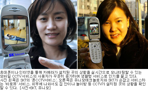 SKÅÚ·¹ÄÞÀº Áý ¾È¿¡ Ä«¸Þ¶ó¸¦ ¼³Ä¡ÇØ ¿ÜºÎ¿¡¼µµ ÈÞ´ëÆùÀ» ÅëÇØ Áý¾È »óŸ¦ È®ÀÎÇÒ ¼ö ÀÖ´Â £§ÆùCCTV£§ ¼ºñ½º¸¦ 2004³âºÎÅÍ Á¦°øÇϰí ÀÖ´Ù. ¹«Àü±â ¹× CCTV Àü¹®¾÷ü À¯´Ï¸ðÅ×Å©³î·ÎÁöµµ Áö³ÇØ ¸» SKÅÚ·¹ÄÞ°ú ¼ÕÀâ°í £§¹Ù·Îºä£§ ¼ºñ½º¸¦ ½ÃÀÛÇØ °¡ÀÔÀÚ¸¦ ²ÙÁØÈ÷ ´Ã·Á°¡°í ÀÖ´Ù.