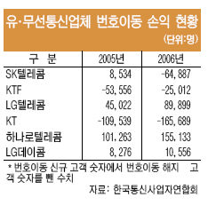 KTÀÇ 16¸¸5689¸í ¼Õ½ÇÀº Àü³âÀÇ ¡®¸¶À̳ʽº 10¸¸9539¸í¡¯º¸´Ù 51%³ª ´Ã¾î³ ¼öÄ¡´Ù. ¹Ý¸é ½Ã³»ÀüÈ ÈĹ߻çÀÎ Çϳª·ÎÅÚ·¹ÄÞ°ú LGµ¥ÀÌÄÞÀÇ °¢°¢ 2006³â ¹øÈ£À̵¿ ÀÌÀÍÀº 2005³â ´ëºñ ¹«·Á 53%, 27%³ª Áõ°¡Çß´Ù.