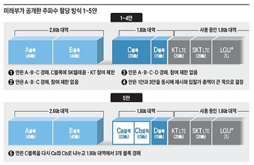 4¾ÈÀº KT°¡ ¾²´Â ÀÎÁ¢´ë¿ªÀ» Æ÷ÇÔÇÏÁö ¾ÊÀº 1¾È°ú Æ÷ÇÔÇÑ 3¾ÈÀ» º¹¼ö·Î Á¦½ÃÇÏ°í °æ¸Å¸¦ ÅëÇØ ÀÔÂû°¡°¡ ³ôÀº °ÍÀ» ¼±Á¤Çϴ ȥÇÕ¹æ½ÄÀÌ´Ù. ±¹È¸ ¹Ì·¡Ã¢Á¶°úÇйæ¼ÛÅë½ÅÀ§¿øÈ¸ÀÇ ÇÑ °ü°èÀÚ´Â £¢5¾ÈÀ» È®Á¤ÇÒ °¡´É¼ºÀÌ ¾à 80% ÀÌ»óÀ¸·Î Å©´Ù£¢¶ó°í ¸»Çß´Ù.