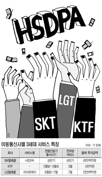 SKÅÚ·¹ÄÞ°ú KTF, LGÅÚ·¹ÄÞÀÌ Â÷¼¼´ë À̵¿Åë½Å ±â¼úÀÎ ¿µ»ó¡¤µ¥ÀÌÅͰí¼ÓÀü¼Û¹æ½Ä(HSDPA) ¼ºñ½º¸¦ ¾ÕµÎ°í ÇÑÆÇ ¡®Áø°Ë¡¯ ½ÂºÎ¸¦ Áغñ ÁßÀÌ´Ù. 3¼¼´ë(G) À̵¿Åë½ÅÀ¸·Î ºÒ¸®´Â HSDPA´Â ÈÞ´ëÀüÈ·Î È»óÅëȰ¡ °¡´ÉÇÏ¸ç ¿µÈ³ª ³ë·¡ µî °¢Á¾ µ¥ÀÌÅ͸¦ Ãʰí¼ÓÀ¸·Î ³»·Á¹Þ°Å³ª ¿Ã·Á¹ÞÀ» ¼ö ÀÖ´Ù. ÀÌµé ¾÷ü´Â Æ÷È»óÅ¿¡ À̸¥ ±¹³» ÀÌÅë½ÃÀå¿¡ HSDPA°¡ ¸ÅÃâ ¼ºÀå µî »õ·Î¿î µ¹ÆÄ±¸¸¦ ¸¶·ÃÇØ ÁÙ °ÍÀ¸·Î ±â´ëÇÏ¸ç ¿ÃÇØºÎÅÍ ÁýÁßÀûÀÎ ¼³ºñ ÅõÀÚ¿Í °¡ÀÔÀÚ È®º¸ Àü·«À» ÆîÄ¥ °èȹÀÌ´Ù.