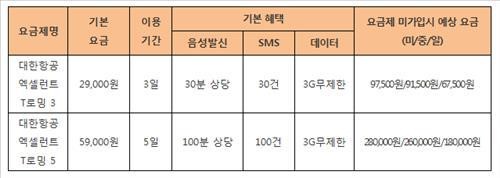 £§´ëÇÑÇ×°ø ¿¢¼³·±Æ® T·Î¹Ö£§¶õ À̸§ÀÇ ÀÌ ¼­ºñ½º´Â 3Àϰ£ µ¥ÀÌÅÍ ¹«Á¦ÇÑ, À½¼º 30ºÐ, ¹®ÀÚ¸Þ½ÃÁö(SMS) 30°ÇÀ» ÀÌ¿ëÇÒ ¼ö ÀÖ´Â £§´ëÇÑÇ×°ø ¿¢¼¿·±Æ® T·Î¹Ö 3ÀÏ£§(2¸¸9õ¿ø)°ú 5Àϰ£ µ¥ÀÌÅÍ ¹«Á¦ÇÑ, À½¼º 100ºÐ, SMS 100°Ç Á¶°ÇÀÇ £§´ëÇÑÇ×°ø ¿¢¼¿·±Æ® T·Î¹Ö 5ÀÏ£§(5¸¸9õ¿ø) µî 2Á¾·ù°¡ ÀÖ´Ù.